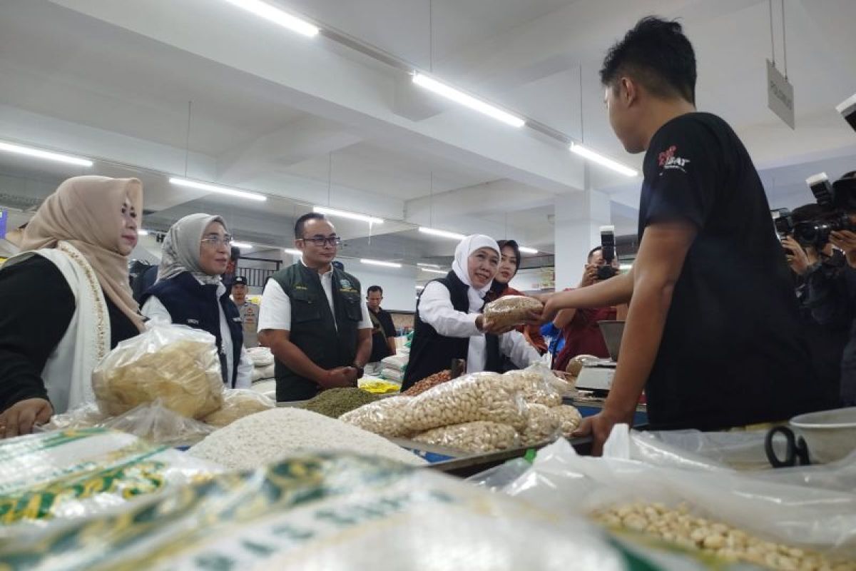 Gubernur Jawa Timur Khofifah Indar Parawansa mengecek harga bahan kebutuhan pokok penting di Pasar Legi, Kabupaten Ponorogo, Minggu, guna memastikan stabilitas harga dan kelancaran distribusi pasca-Idul Fitri 2026.