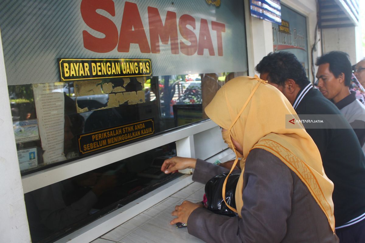 Pemilik kendaraan antre membayar pajak saat Program Pemutihan Pajak Kendaraan Bermotor di Samsat Corner di Alun-alun Malang, Jawa Timur, Senin (8/10). Program yang berlangsung selama 68 hari tersebut diadakan Pemprov Jatim untuk mendorong masyarakat memenuhi kewajibannya membayar pajak sekaligus mengoptimalisasikan semua jenis layanan Samsat sehingga diharapkan mampu meningkatkan pendapatan daerah. Antara Jatim/Ari Bowo Sucipto/mas/18.