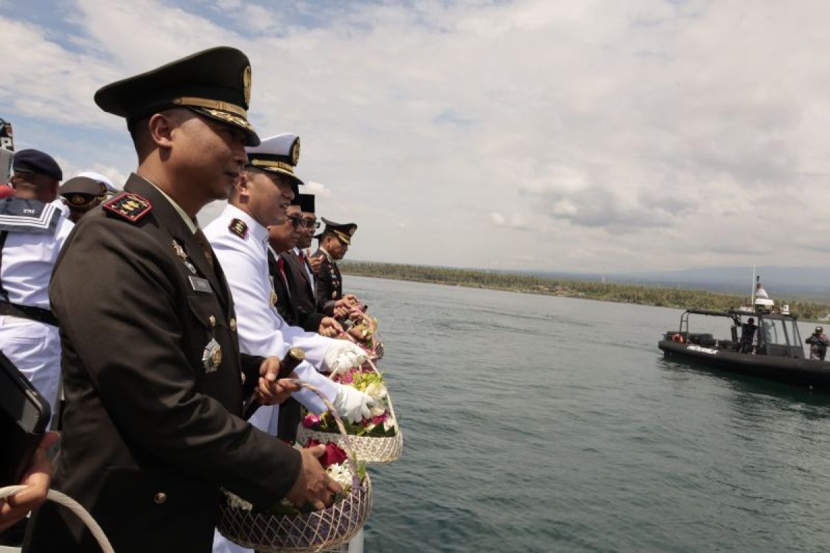 Suasana haru terasa saat mengheningkan cipta sebagai bentuk penghormatan kepada para pahlawan, termasuk kru kapal selam KRI Nanggala 402 yang gugur dalam tugas, dilanjutkan pelarungan karangan bunga sebagai penghormatan terakhir kepada arwah para pahlawan, hingga ditutup tabur bunga di laut.