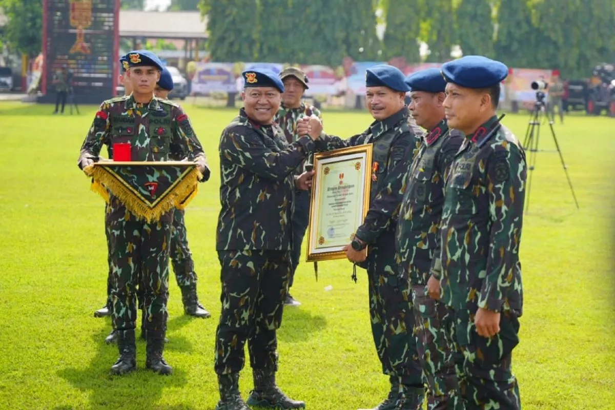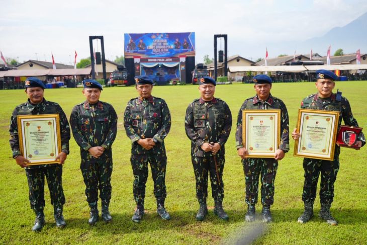 Piagam penganugerahan dan lencana diberikan Dansat Brimob Polda Jatim Kombespol Suryo Sudarmadi kepada Wali Kota Maidi bersamaan dengan seremonial syukuran peringatan ke-80 HUT Korp Brimob Polri Polda Jatim di Mako Kompi 3 Batalyon A Pelopor Satuan Brigade Mobil Polda Jatim, Jumat (14/11/2025).