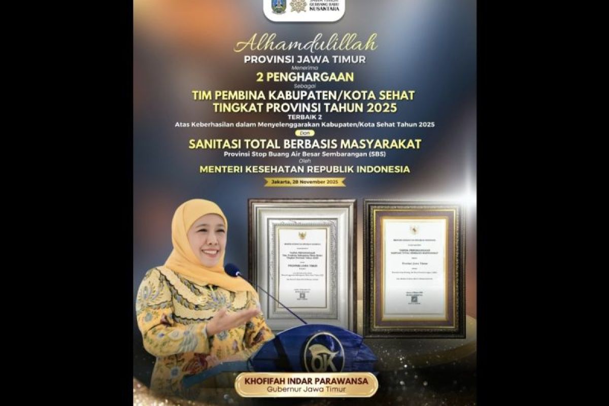 Surabaya (ANTARA) - Pemerintah Provinsi Jawa Timur menegaskan komitmen meningkatkan kualitas kesehatan masyarakat usai meraih dua penghargaan dari Kementerian Kesehatan Republik Indonesia pada ajang Kabupaten/Kota Sehat dan Sanitasi Total Berbasis Masyarakat Award 2025.