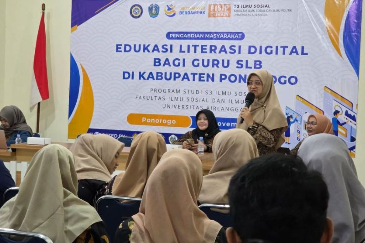 Ponorogo, Jawa Timur (ANTARA) - Program Pengabdian Masyarakat Program Doktor Ilmu Sosial Fakultas Ilmu Sosial dan Ilmu Politik Universitas Airlangga (Unair) Surabaya memperkuat literasi digital guru sekolah luar biasa melalui pelatihan penggunaan teknologi yang aman, etis, dan adaptif bagi siswa berkebutuhan khusus/disabilitas di Kabupaten Ponorogo, Jawa Timur, Sabtu.