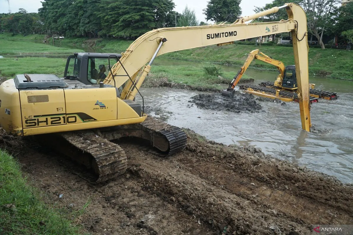 Pekerja mengoperasikan alat berat eksavator untuk mengeruk seimen di aliran Sungai Ngrowo, Tulungagung, Jawa Timur, Selasa (2/12/2025). Normalisasi sungai dilakukan untuk mencegah pendangkalan yang berpotensi memicu banjir dalam kota saat penghujan. ANTARA Jatim/Destyan Sujarwoko/mas.