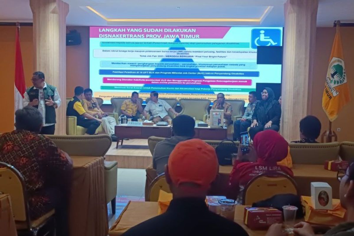 Surabaya (ANTARA) - Partai Golkar Jawa Timur menggelar Forum Group Discussion (FGD) bertema “Merajut Desain Peraturan Daerah Disabilitas Provinsi Jawa Timur” sebagai langkah awal merumuskan regulasi baru yang lebih inklusif, komprehensif, dan berpihak pada kebutuhan riil penyandang disabilitas.