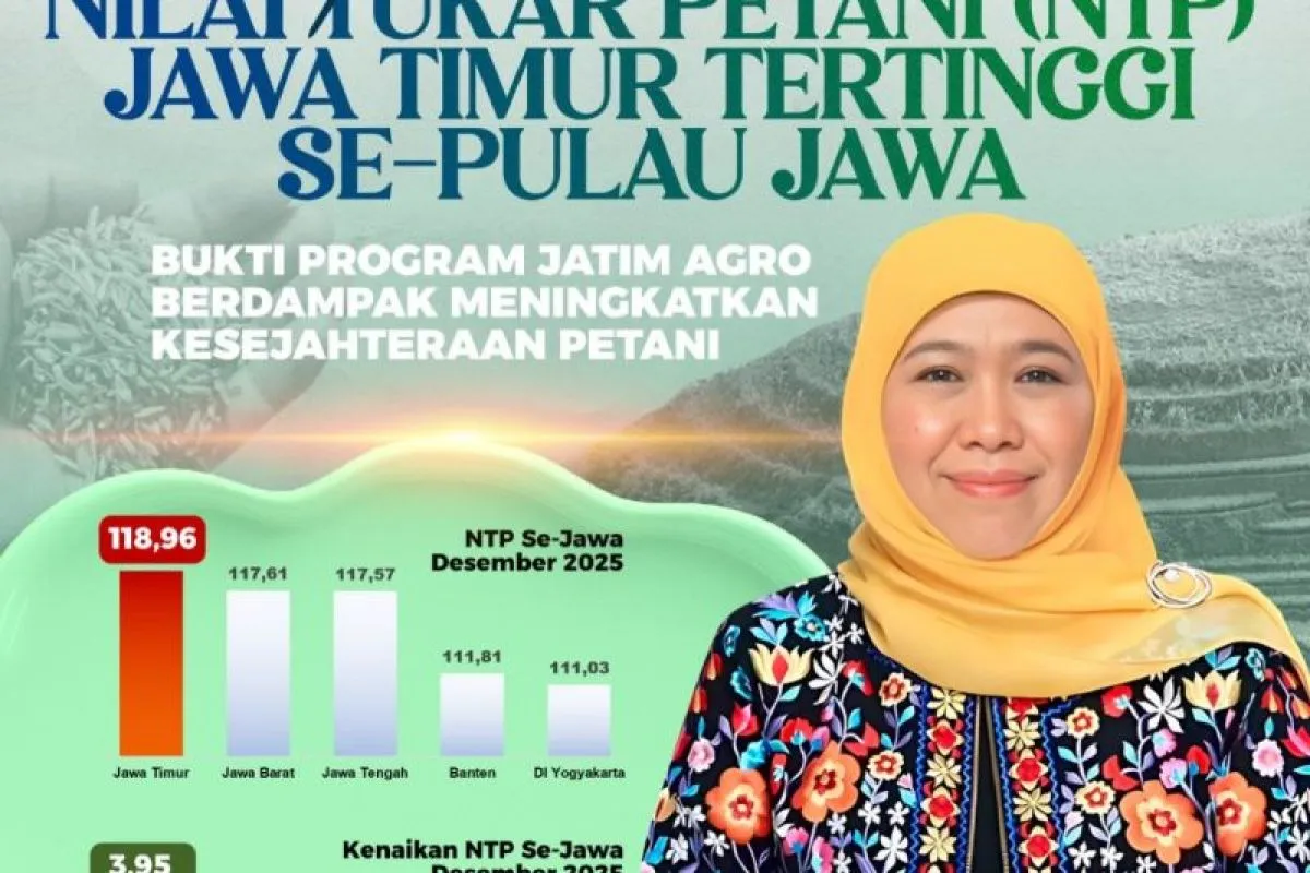 “Capaian NTP Jawa Timur bulan Desember merupakan yang tertinggi sepanjang tahun 2025 dan juga tertinggi di Pulau Jawa. Ini menjadi indikator positif bahwa pendapatan petani kita terus meningkat dan kesejahteraan mereka semakin membaik,” ujar Khofifah di Surabaya, Kamis.