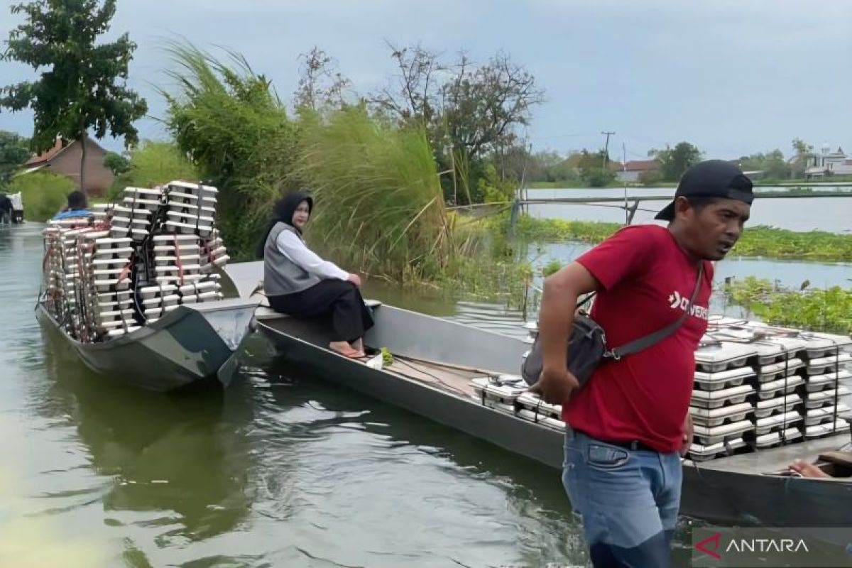 Ia menjelaskan, ratusan ompreng MBG dipindahkan secara manual dari mobil ke perahu, kemudian didayung sejauh sekitar 500 meter di genangan air setinggi kurang lebih 80 sentimeter guna menjaga keamanan dan kebersihan wadah makanan.