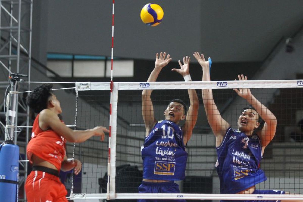 Pevoli Jakarta Bhayangkara Presisi, Arjuna Mahendra (kiri) melakukan smes yang mencoba ditahan pevoli Jakarta Lavani Livin Transmedia Reyval Deho Fernanda (tengah) dan Hendra Kurniawan (kanan) dalam pertandingan Proliga 2026 putaran kedua minggu kelima di GOR Ken Arok, Malang, Jawa Timur, Kamis (5/2/2026). Jakarta Lavani mengalahkan Bhayangkara Presisi dengan skor 3-0 (25-19, 25-17, 25-21). Antara Jatim/Ari Bowo Sucipto