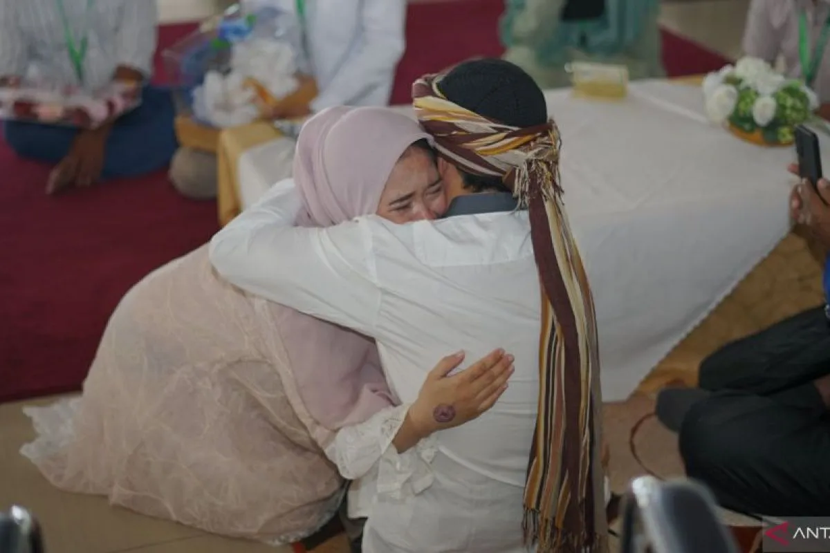 Terpidana kasus terorisme ZJ memeluk putrinya yang dinikahkan di Masjid Nurul Fuad Lapas Kelas I Surabaya di Porong, Sidoarjo, Jumat (6/2/2025). ANTARA/HO-Lapas Kelas 1 Surabaya
