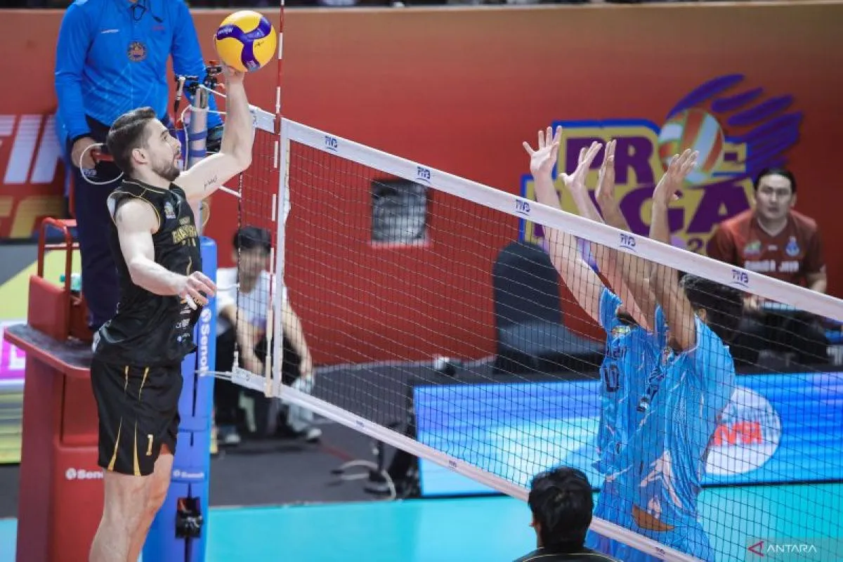 Pevoli Jakarta Bhayangkara Presisi Martin Petrov Atanasov (kiri) melakukan smes yang coba diblok Jakarta Garuda Jaya Mosvar Bataev (kedua kanan) dan Kristoforus Sina (kanan) pada pertandingan minggu pertama Final Four Proliga 2026 di Jawa Pos Arena, Surabaya, Jawa Timur, Sabtu (4/4/2026). Jakarta Bhayangkara Presisi menang atas Jakarta Garuda Jaya dengan skor 3-0 (25-18, 25-14, dan 25-17). ANTARA Jatim/Rizal Hanafi/mas.