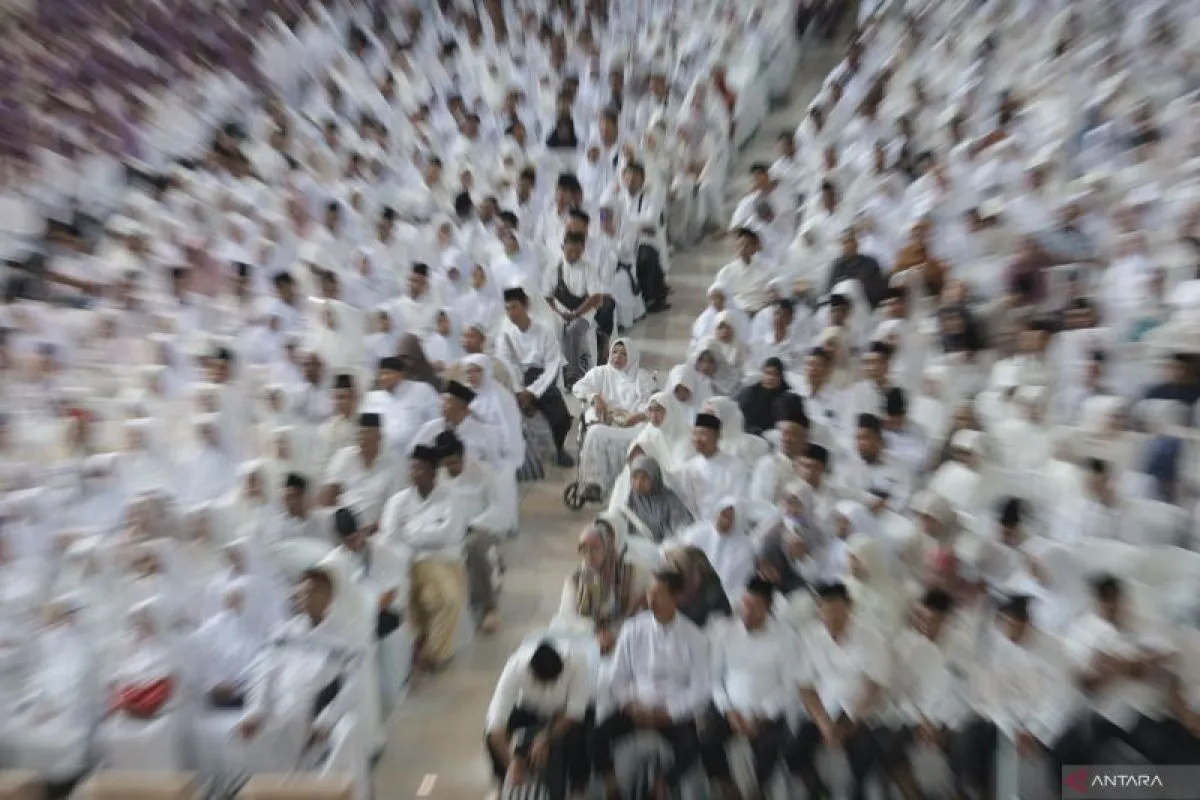 Jamaah calon haji mengikuti upacara pelepasan di Kabupaten Kediri, Jawa Timur, Selasa (7/4/2026). Sebanyak 1.275 jamaah calon haji dari Kabupaten Kediri yang dibagi dalam 4 kloter akan diberangkatkan menuju Tanah Suci. ANTARA Jatim/Prasetia Fauzani/mas.
