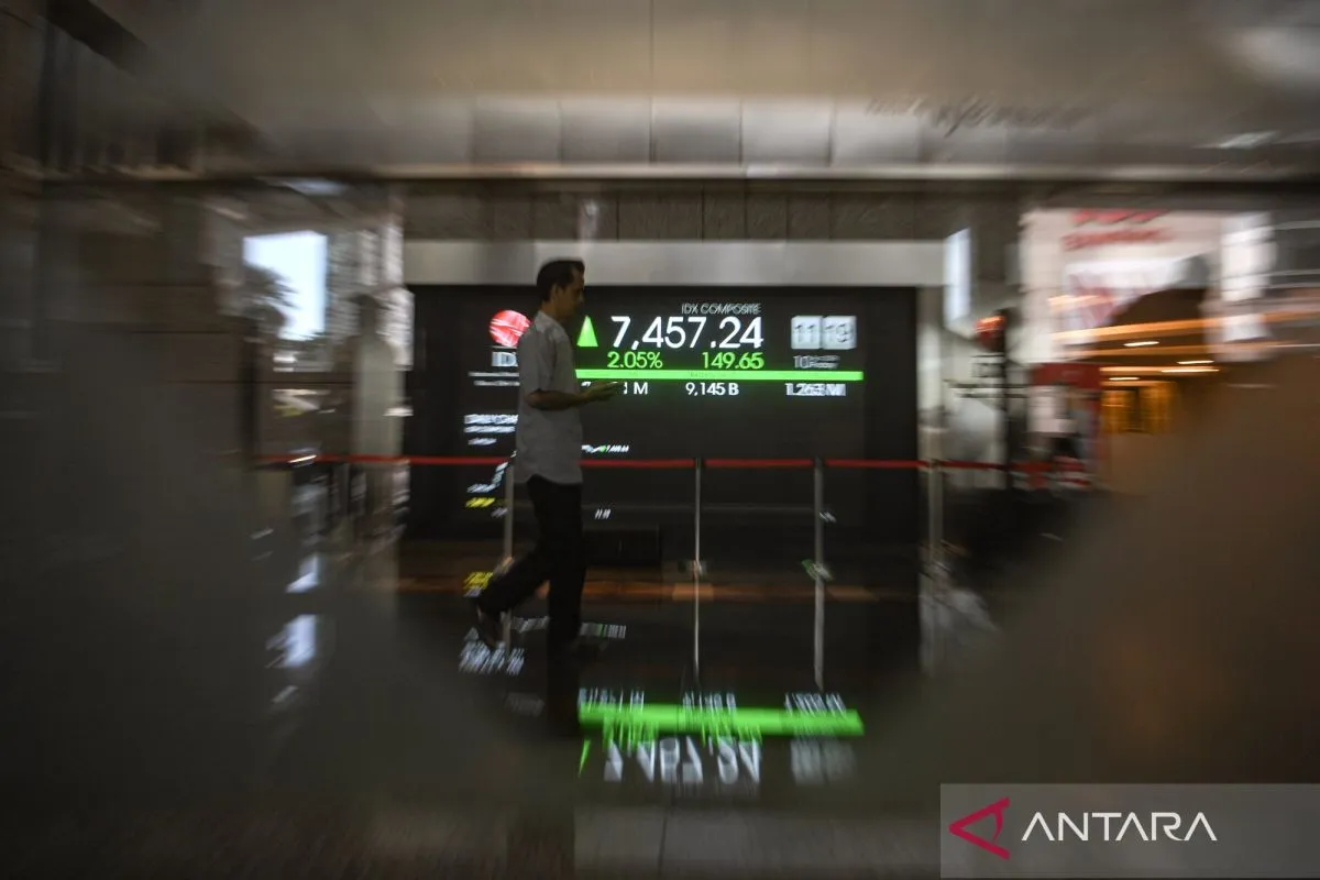 Data penutupan perdagangan BEI pada Jumat (10/4) sore, IHSG ditutup menguat 150,91 poin atau 2,07 persen ke posisi 7.458,50. Sementara kelompok 45 saham unggulan atau indeks LQ45 naik 12,57 poin atau 1,71 persen ke posisi 746,47.
