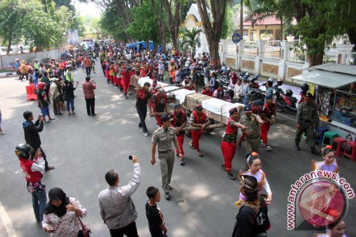 Proses memindahkan kayu jati dilakukan oleh puluhan warga, dengan cara dipikul dengan bantuan gerobak dari tempat penimbunan kayu (TPK) di Desa Sukorejo, Kecamatan Kota, ke alun-alun.