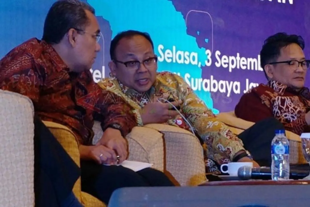 Surabaya (Antara Jatim) - Direktur Direktorat Pengembangan Kebijakan Perlindungan Konsumen Otoritas Jasa Keuangan (OJK), Anto Prabowo (tengah), berbincang dengan Komisioner Badan Perlindungan Konsumen Nasional, David Tobing (kiri), di sela-sela seminar tentang perlindungan konsumen, di Surabaya, Selasa (3/9). Kegiatan yang dihadiri oleh sejumlah pengamat ekonomi dan insan perbankan tersebut, bertajuk 'Sosialisasi Peraturan Otoritas Keuangan Tentang Perlindungan Konsumen Di Sektor Jasa Keuangan'. FOTO Eric Ireng/13