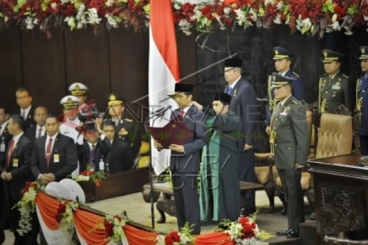 Jakarta (Antara) - Presiden Terpilih Joko Widodo mengucapkan sumpah jabatan saat pelantikannya di Gedung Nusantara I, Kompleks Parlemen Senayan, Jakarta, Senin (20/10). Joko Widodo - Jusuf Kalla resmi menjabat sebagai Presiden dan Wakil Presiden Republik Indonesia masa bakti 2014 - 2019.