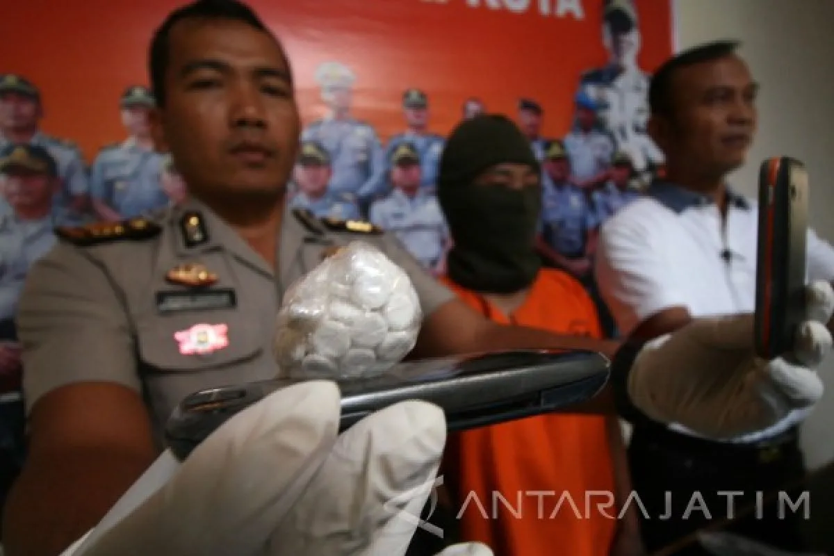 Polisi menunjukkan barang bukti pil dobel L sebayak 300 butir beserta tersangka pengedarnya berinisial IS saat gelar perkara penyalah gunaan narkoba di Mapolresta Kediri, Jawa Timur, Sabtu (20/8). Tersangka mengaku mendapatkan obat ilegal tersebut se