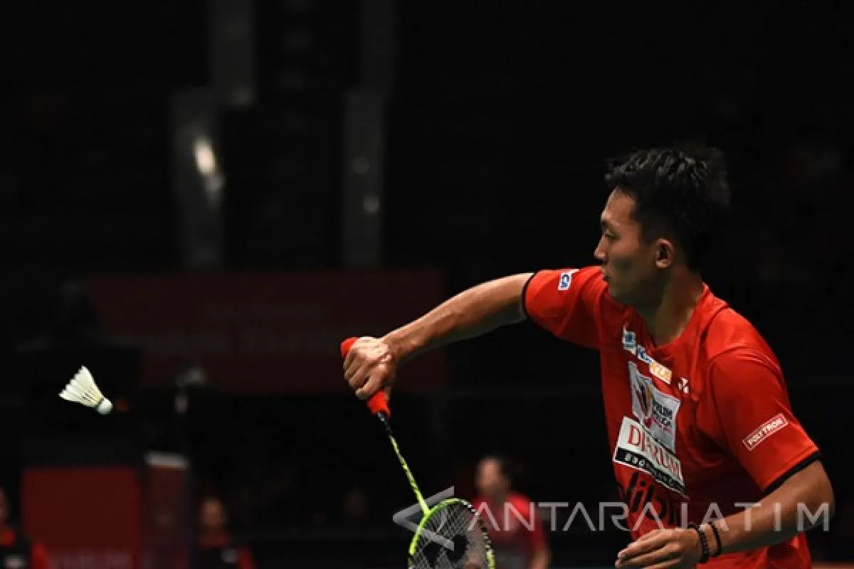 Pebulu tangkis putra asal PB Djarum Kudus Ihsan Maulana Mustofa berusaha mengembalikan kok kearah lawan pebulu tangkis putra asal klub Sports Affairs Chun Seang Tan dalam penyisihan grup B Djarum Superliga Badminton 2017 di DBL Arena Surabaya, Jawa Timur, Minggu (19/2). Ihsan Maulana Mustofa menang dengan skor 2-0 (21-14,21-13). Antara Jatim/M Risyal Hidayat/zk/17