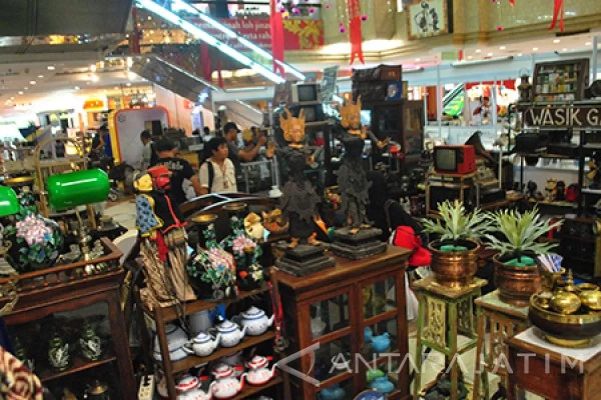 Pengunjung mengamati koleksi barang antikyang dipamerkan pada Soerabaia Heritage Festival di Plaza Surabaya, Jawa Timur, Senin (13/3). Pameran yang berlangsung hingga 19 Maret 2017 tersebut menampilkan sejumlah koleksi seperti prangko, uang kuno dan barang jadul lainnya. Antara Jatim/Naufal Ammar/zk/17.