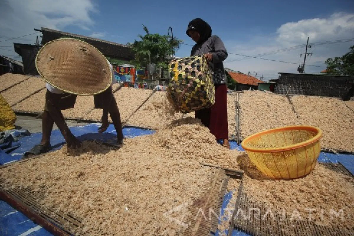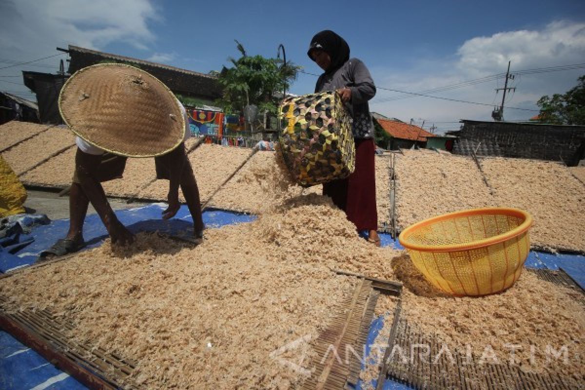 Warga menjemur udang rebon di Kampung Nelayan Nambangan, Surabaya, Jawa Timur, Selasa (4/4). Menurut nelayan setempat tangkapan udang rebon dalam beberapa hari terakhir mengalami peningkatan dari rata-rata hanya 5-10 kilogram perhari menjadi 100-200 kilogram perhari untuk kemudian dijual dengan harga Rp25.000-Rp30.000 perkilogramnya. Antara Jatim/Moch Asim/zk/17