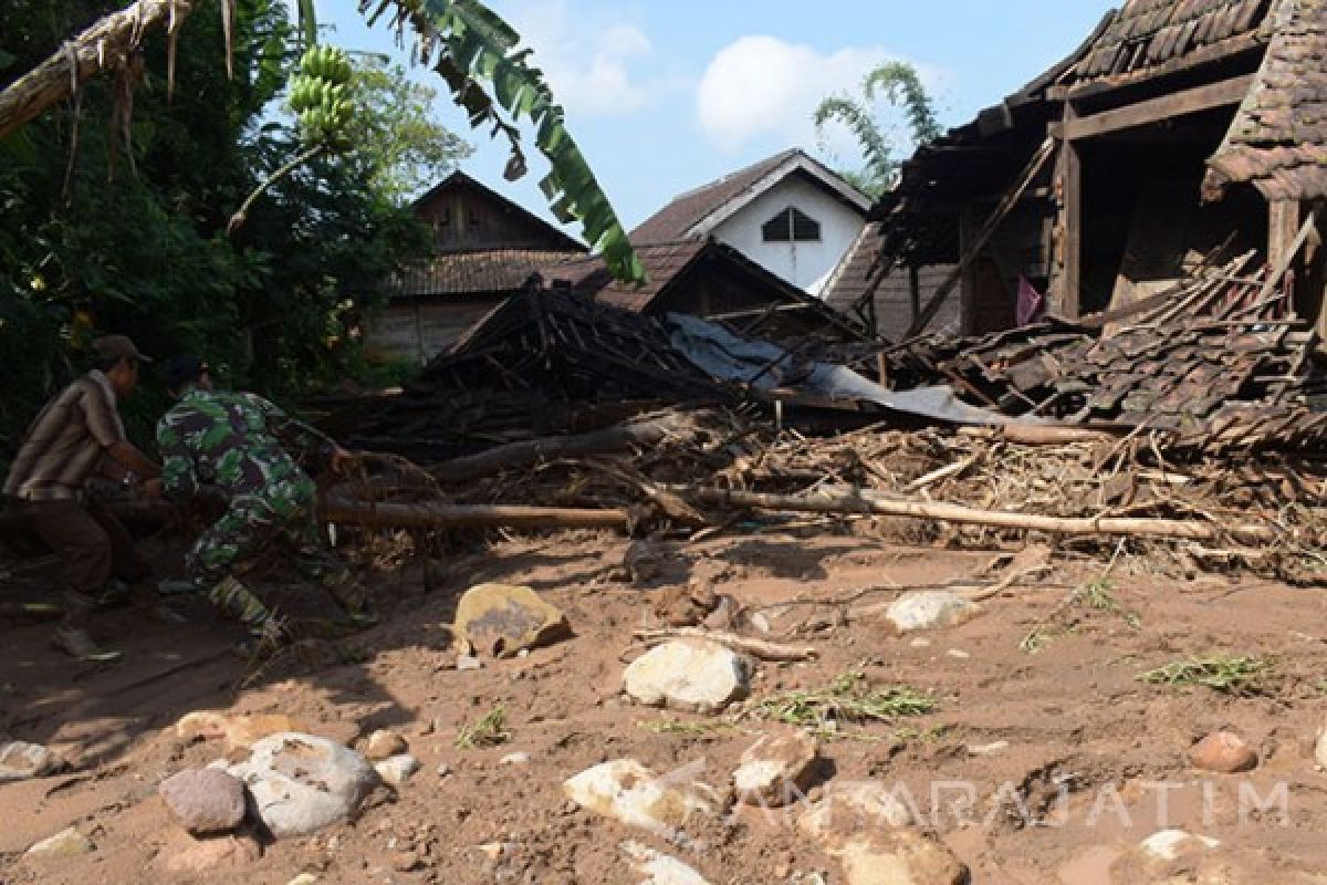 Prajurit TNI bersama warga membersihkan reruntuhan rumah di kawasan longsor Desa Banaran, Pulung, Ponorogo, Jawa Timur, Kamis (20/4). Luapan sungai yang membawa material longsoran bukit mengakibatkan sebuah rumah hanyut dan dua rumah roboh. Antara Jatim/Siswowidodo/zk/17