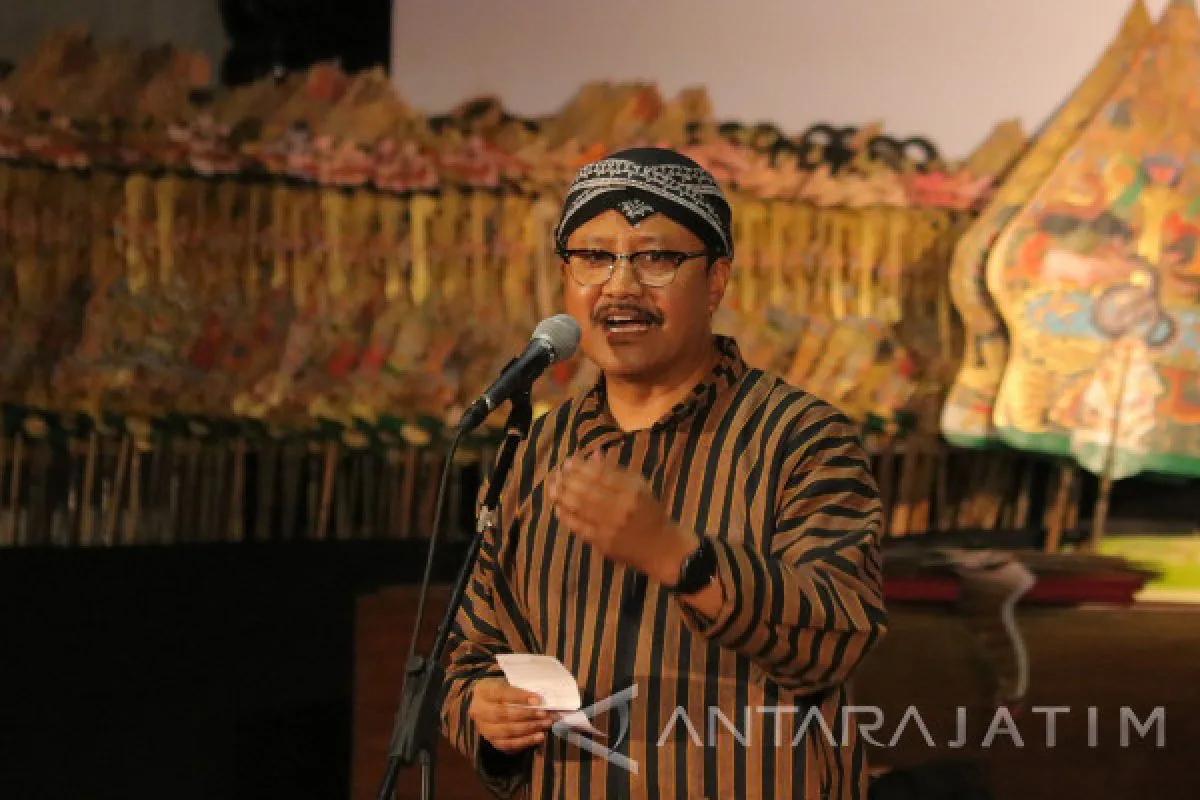 Wakil Gubernur Jawa Timur Saifullah Yusuf memberikan sambutan saat Festival Wayang Kulit di Surabaya, Jawa Timur, Selasa (17/10). Pagelaran wayang kulit dengan dalang Ki Manteb Soedharsono dengan Ki Anom Suroto berlakon 'Lamabad Wonomarto' itu dalam rangka Hari Jadi Ke-72 Provinsi Jawa Timur. Antara Jatim/Didik Suhartono/uma/17