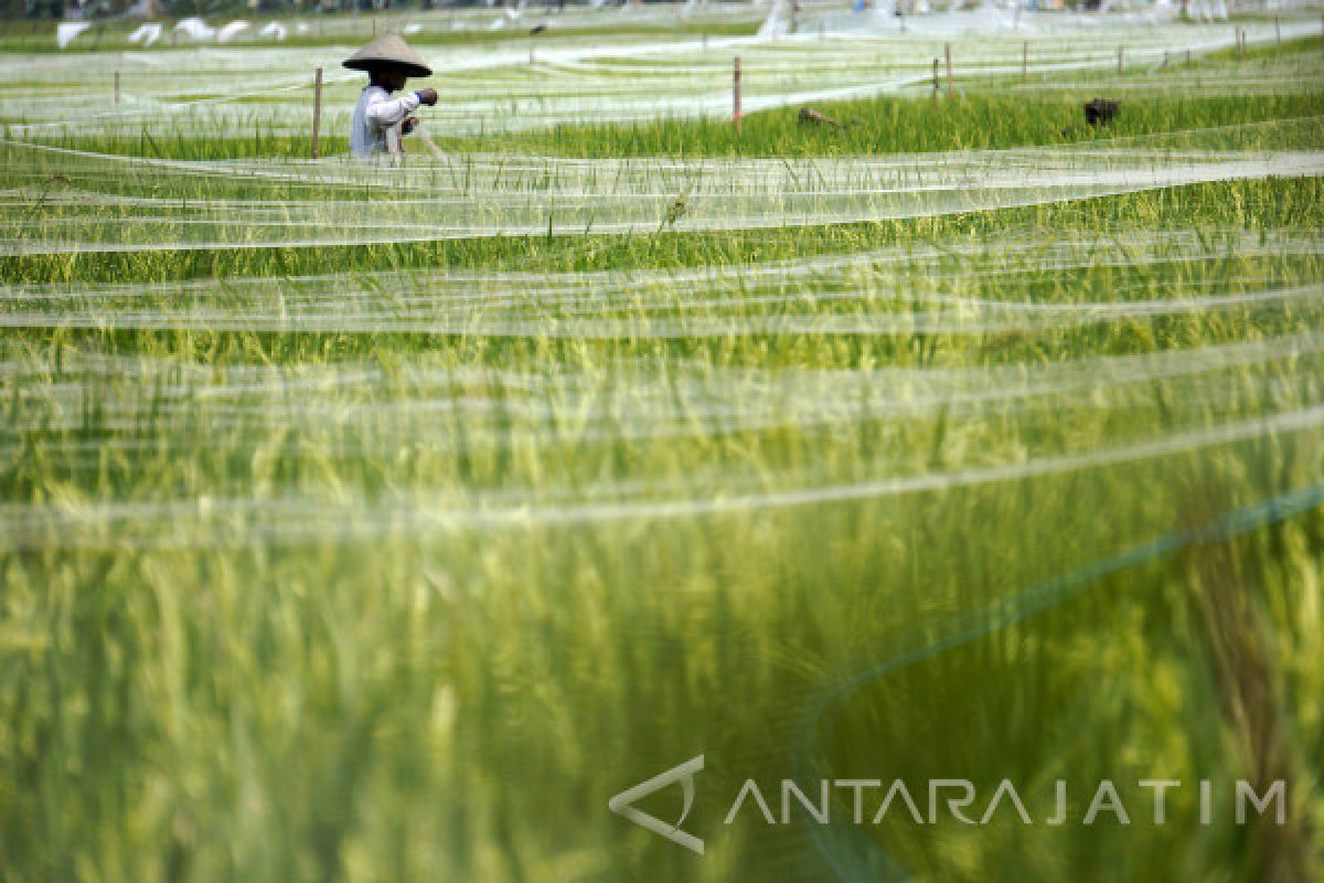 Petani memasang jaring antihama terbuat dari serat nilon (paranet) di atas tanaman padi yang mulai berbuah di areal persawahan Kota Tulungagung, Jawa Timur, Jumat (3/11). Pemasangan jaring itu bertujuan mencegah serangan ribuan hama burung pipit yang