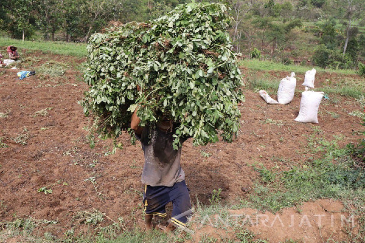 Buruh tani memanen kacang tanah di area pertanian lereng gunung Wilis, Desa Selopanggung, Kediri, Jawa Timur, Kamis (9/11). Kacang tanah menjadi komoditas andalan petani di daerah tersebut karena dapat tumbuh maksimal tanpa harus memerlukan banyak air dan harga jualnya stabil pada kisaran Rp12.000 per kilogram. Antara Jatim/Prasetia Fauzani/mas/17.