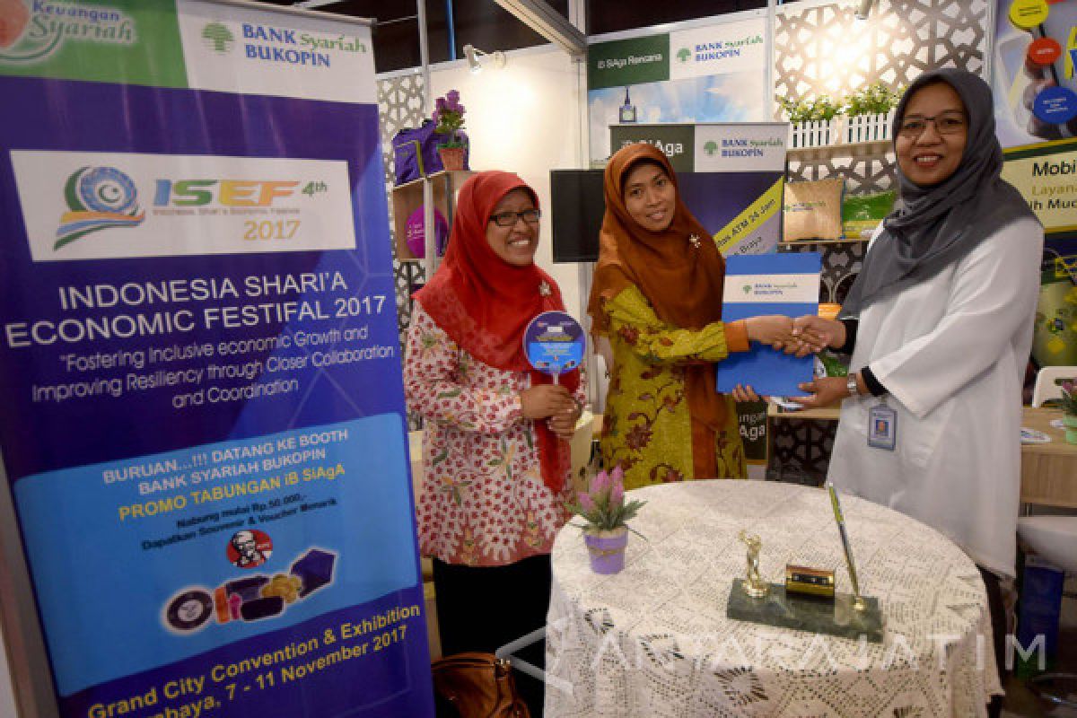 Pimpinan Cabang PT Bank Syariah Bukopin (BSB) Surabaya Trisna Surjati (kanan) menyerahkan nota kesepahaman pada Dekan Fakultas Keislaman Universitas Trunojoyo Madura Shofiyun Nahidloh (kedua kanan) disela-sela 'The 4th Indonesia Sharia Economic Festival' (ISEF) 2017 atau Festival Ekonomi Syariah Indonesia 2017 di Surabaya, Jawa Timur, Kamis (9/11). Nota kesepahaman tersebut guna meningkatkan kerja sama antara para pihak secara berkesinambungan dalam memberikan edukasi (in class) mengajar kepada mahasiswa fakultas keislaman tentang perbankan syariah sekaligus menerima mahasiswa magang setiap tahunnya di PT Bank Syariah Bukopin (BSB) Surabaya. Antara Jatim/M Risyal Hidayat/mas/17.