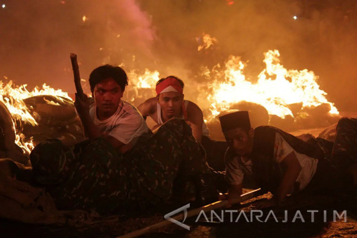 Sejumlah peserta menampilkan teatrikal pertempuran dalam drama kolosal Surabaya Membara di Jalan Pahlawan, Surabaya, Jawa Timur, Kamis (9/11). Drama yang diikuti ratusan peserta tersebut dalam rangka memperingati Hari Pahlawan. Antara Jatim/Moch Asim
