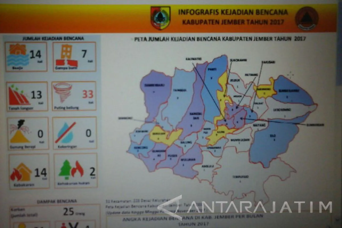 "Sebenarnya potensi terjadi angin puting beliung bisa terjadi di 31 kecamatan di Jember, sehingga kami imbau masyarakat untuk selalu siaga terhadap ancaman angin kencang tersebut selama musim pancaroba seperti saat ini," tuturnya.