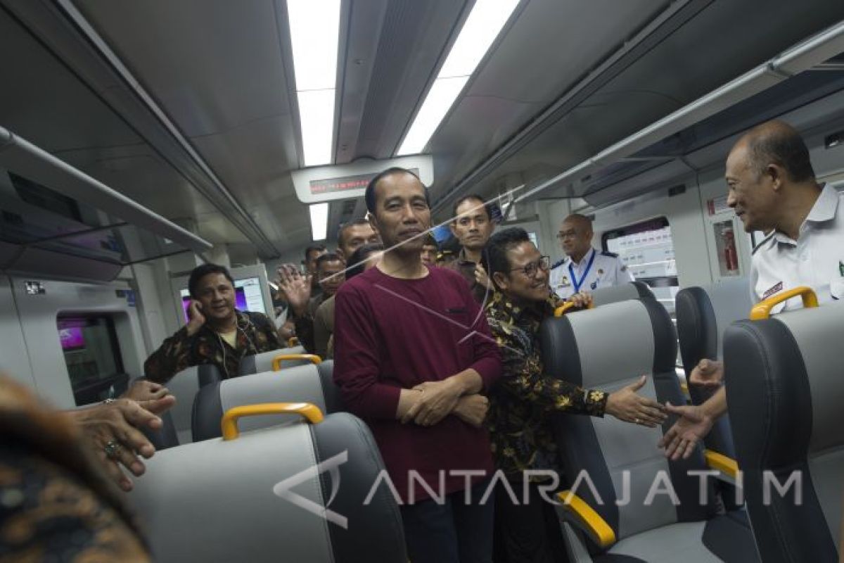 Presiden Joko Widodo (kiri) menaiki kereta bandara usai peresmian pengoperasian kereta bandara di Stasiun Bandara Soekarno-Hatta, Tangerang, Banten (2/1). . Antara Foto/Rosa Panggabean/nz/18.