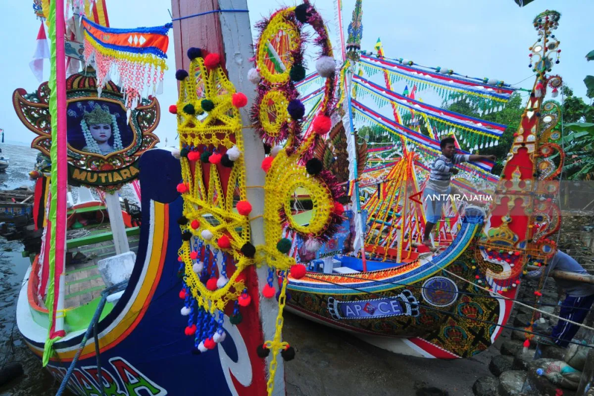 Nelayan menghias perahu di Pantai Kaduara Timur, Pragaan, Sumenep, Jawa Timur, Sabtu (3/3). Sedikitnya 90 perahu dihias guna memeriahkan pelaksanaan Petik Laut yang digelar tanggal 3-5 Maret 2018. Antara Jatim/Saiful Bahri/zk/18