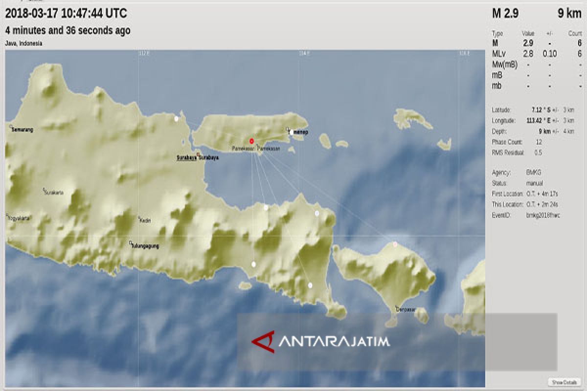 Pamekasan (Antaranews Jatim) - Badan Meteorologi Klimatologi dan Geofisika (BMKG), Sabtu melaporkan, gempa berkekuatan 2,9 skala Richter (SR) sekitar pukul 17.47 WIB telah terjadi di Pamekasan, Jawa Timur.