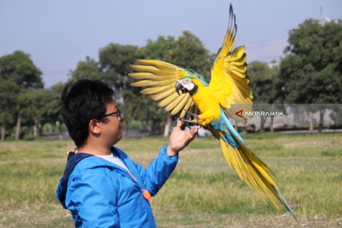 Anggota komunitas 'Kediri Free Flight Community' menerbangkan burung Macao di lapangan Simpang Lima Gumul, Kediri, Jawa Timur, Jumat (6/4). Latihan terbang burung paruh bengkok tersebut guna menjaga kondisi kebugaran burung. Antara Jatim/Prasetia Fauzani/zk/18