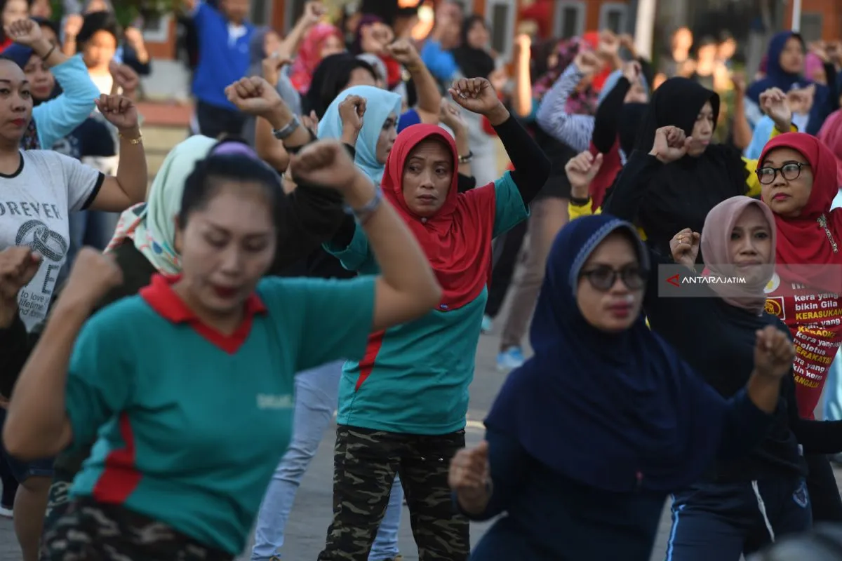 Senam “Goyang Dayung” massal yang digelar saat Car Free Day (CFD) di alun-alun Lamongan tersebut diikuti oleh ratusan masyarakat.