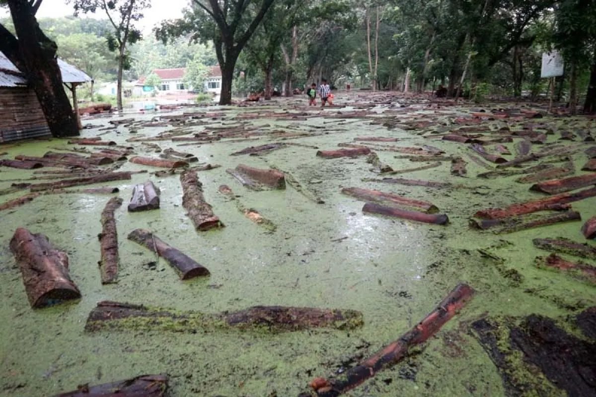 Ratusan balok kayu jati berserakan mengambang di jalanan di Tempat Penimbunan Kayu Jati (TPK) Bojonegoro, Jawa Timur, terendam air banjir, Rabu (6/3). Namun pihak Kesatuan Pemangkutan Hutan (KPH) Bojonegoro, memastikan sekitar 800 meter kubik kayu jati berupa balok dengan berbagai ukuran yang terendam air banjir tidak merusak kualitasnya. Antarajatim/Slamet Agus Sudarmojo/19.