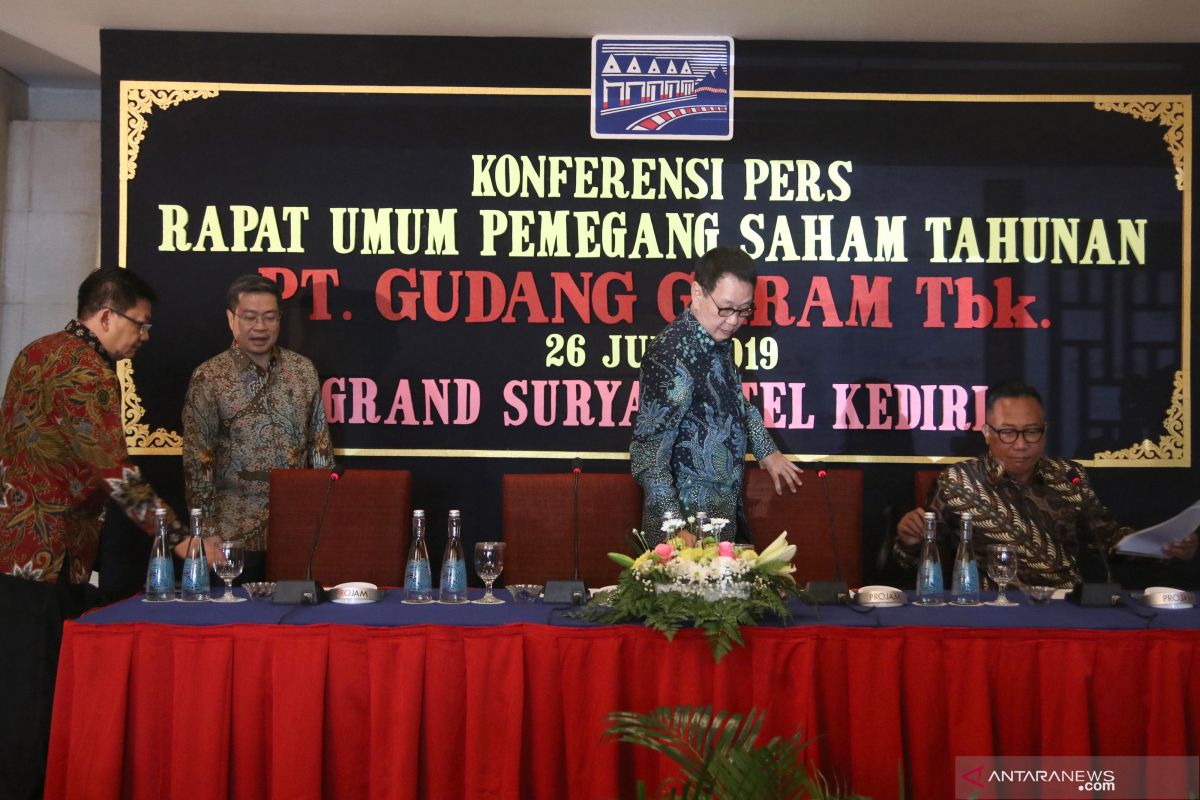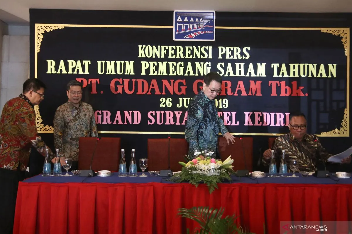 Jajaran direksi PT. Gudang Garam Tbk. Herry Susianto (kiri), Istata Taswin Siddharta (ke dua kiri), Slamet Budiono (kanan), dan Heru Budiman (ke dua kanan) bersiap melakukan konferensi pers Rapat Umum Pemegang Saham (RUPS) PT. Gudang Garam Tbk. di Kota Kediri, Jawa Timur, Rabu (26/6/2019). RUPS PT. Gudang Garam Tbk. menetapkan pembagian deviden untuk tahun buku 2018 sama persis dengan tahun buku 2017 dan 2016 yakni sebesar Rp5.002.628.800.000 (lima triliun dua miliar enam ratus dua puluh delapan juta delapan ratus ribu rupiah), dengan besar deviden yang diterima pemegang saham senilai Rp2.600 per saham. Antara Jatim/Prasetia Fauzani/zk
