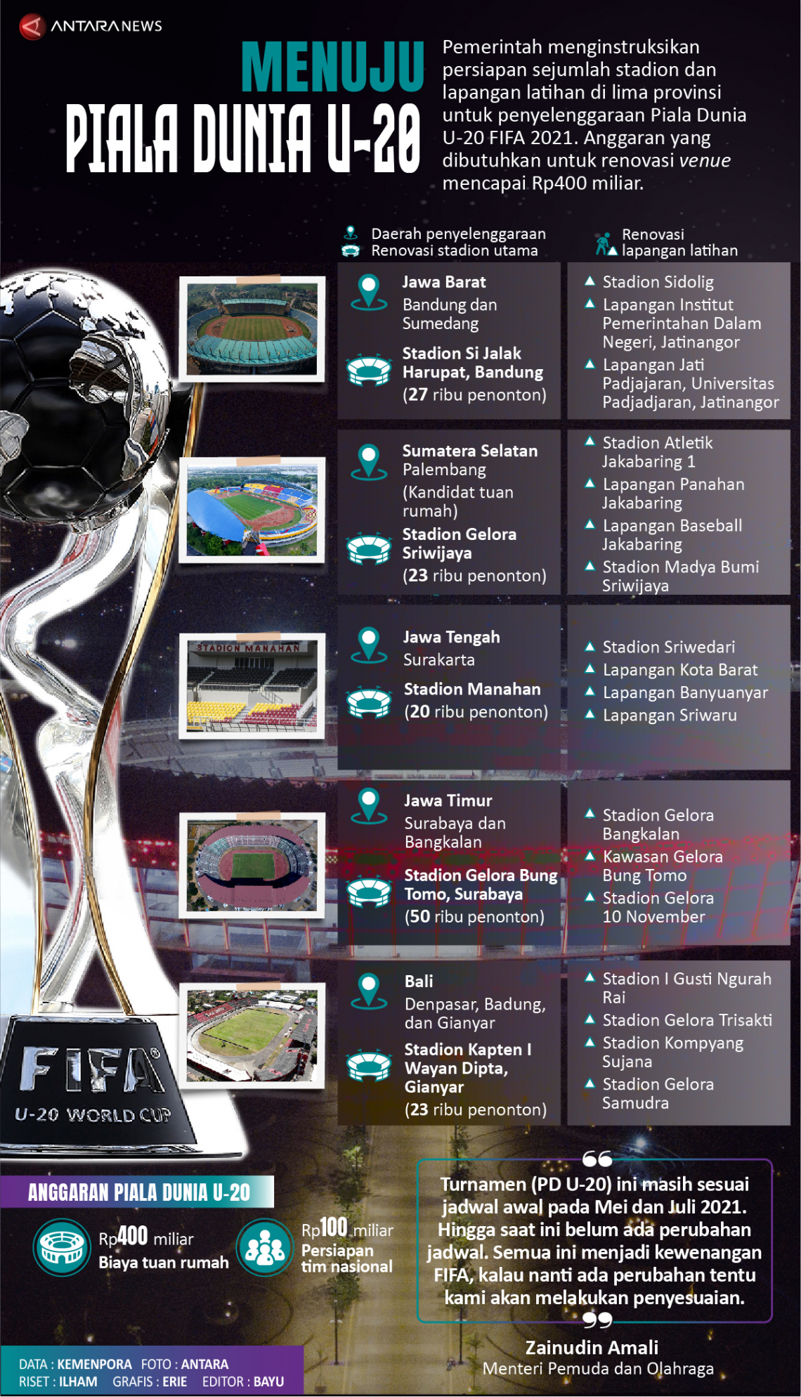 Jakarta (ANTARA) - Pemerintah menginstruksikan persiapan sejumlah stadion dan lapangan latihan di lima provinsi untuk penyelenggaraan Piala Dunia U-20 FIFA 2021. Anggaran yang dibutuhkan untuk renovasi venue mencapai Rp400 miliar.