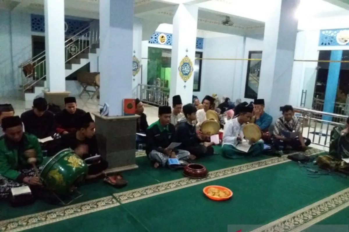 Aktivis Keluarga Mahasiswa Nahdlatul Ulama (KMNU) Institut Pertanian Bogor (IPB) University dari "majelis dibaiyah" sedang melakukan kegiatan pelestarian tradisi seni budaya dan keagamaan lingkungan "Nahdliyyin" di Kampus IPB Dramaga, Kabupaten Bogor, Jawa Barat. (FOTO ANTARA/HO-Humas KMNU IPB University/2020)