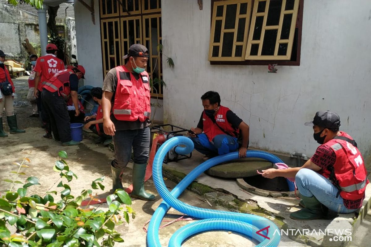 Relawan Tim Wash PMI Jember membantu menguras sumur warga di Kelurahan/Kecamatan Sumbersari, Kabupaten Jember, Selasa (2/2/2021). (ANTARA/ HO - PMI Jember)