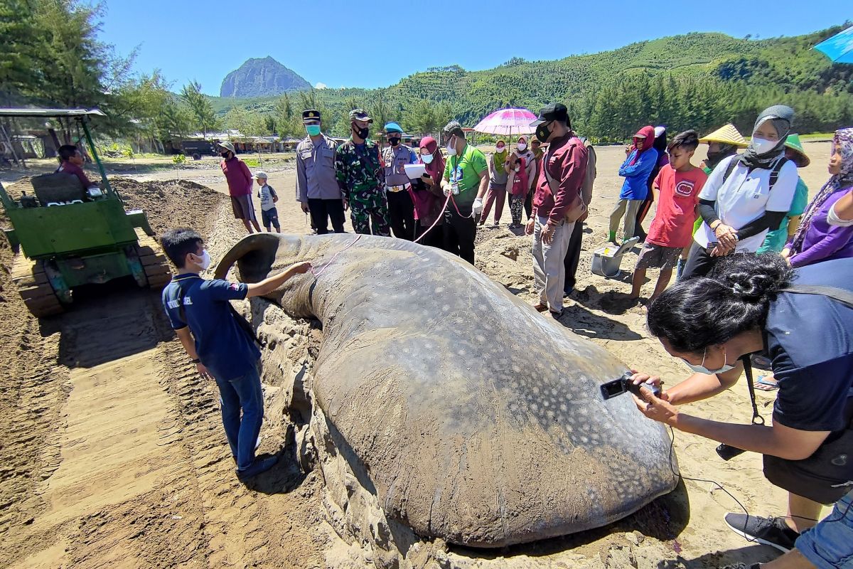 Petugas mengukur lingkar badan hiu paus (Rhincodon typus) yang terdampar dan mati di Pantai Bayeman, Tulungagung, Jawa Timur, Jumat (23/4/2021). Hiu paus muda diperkirakan berusia antara 2-3 tahun dengan panjang 7,4 meter dan lingkar badan 2 meter itu terdampar di perairan dangkal Pantai Gemah sejak Kamis (22/4) sore, sekitar pukul 17.30 WIB setelah tubuhnya terjerat jaring pukat nelayan. Antara Jatim/Destyan Sujarwoko/zk.