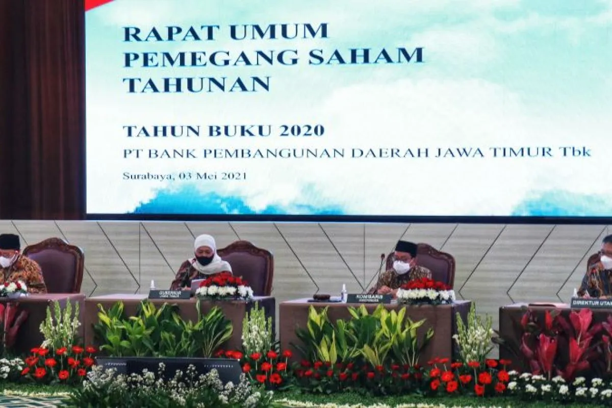 Direktur Utama Bank Jatim Busrul Iman pada RUPST TB 2020 di Ruang Bromo, Kantor Pusat Bank Jatim lantai 5, Surabaya, Senin mengatakan secara keseluruhan, total dividen yang dibagikan kepada pemegang saham sebesar Rp733,5 miliar lebih atau sebesar 49,26 persen dari laba bersih tahun buku 2020.