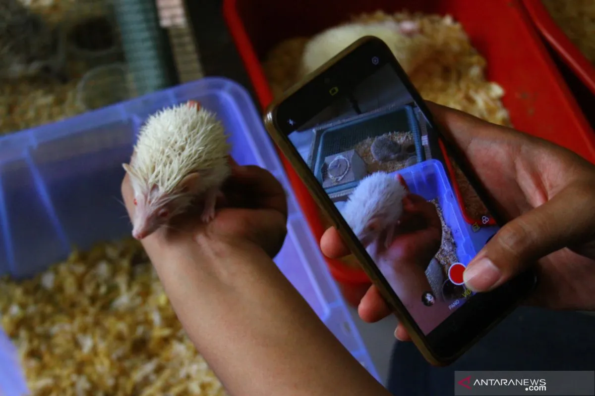 Peternak memotret landak mini (Erinaceinae) hasil budidayanya untuk diunggah di pasar digital di peternakan Vero Hedgehog, Malang, Jawa Timur, Sabtu (2/10/2021). Peternak landak mini setempat mengaku kewalahan memenuhi permintaan anakan landak mini yang meningkat 50 persen dalam beberapa bulan terakhir. Antara Jatim/Ari Bowo Sucipto/zk.