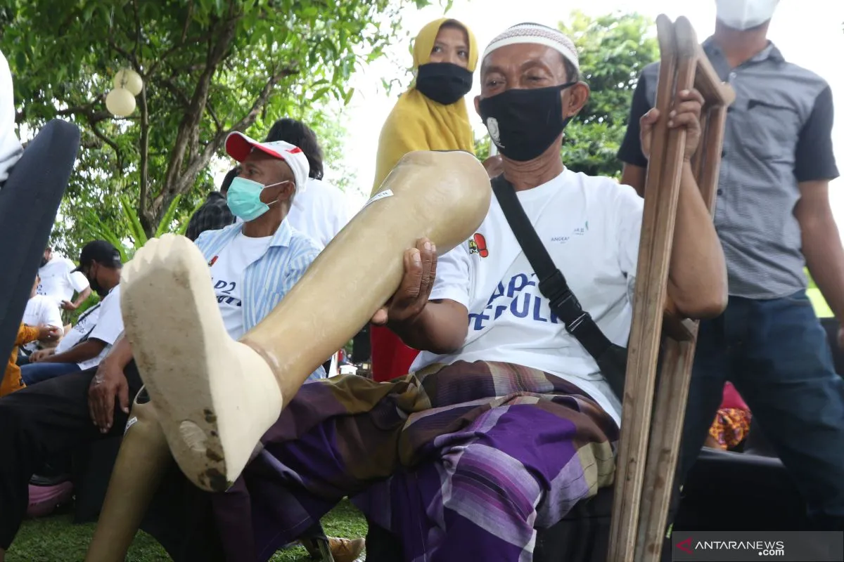 Warga penerima mengecek kaki palsu yang diberikan secara gratis oleh Angkasa Pura II di Pendopo Banyuwangi, Jawa Timur, Kamis (11/11/2021). Sebanyak 24 kaki palsu bantuan dari program CSR Angkasa Pura II yang bekerja sama dengan yayasan Kick Andy Foundation itu untuk membantu penyandang disabilitas yang membutuhkan agar lebih bisa mandiri dan memudahkan dalam beraktivitas sehari-hari. Antara Jatim/Budi Candra Setya/zk