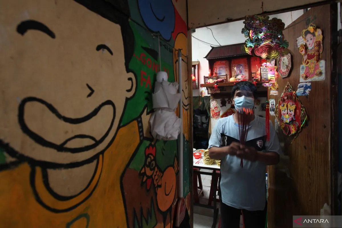 Warga keturunan Tionghoa berdoa untuk leluhurnya di depan rumahnya di kampung pecinan Tambak Bayan, Surabaya, Jawa Timur, Senin (31/1/2022). Kegiatan sembayang leluhur itu diadakan sehari menjelang perayaan Tahun Baru Imlek. Antara Jatim/Didik Suhartono/zk