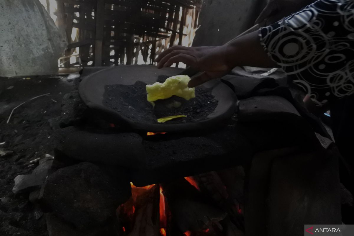 Perajin menggoreng kerupuk menggunakan media pasir di Desa Kendit, Kendit, Situbondo, Jawa Timur, Minggu (20/2/2022). Permintaan kerupuk seharga Rp500 per keping tersebut mengalami kenaikan sekitar dua kali lipat dari biasanya menghabiskan bahan baku enam kilogram per hari menjadi 12 kilogram per hari. Antara Jatim/Seno/zk