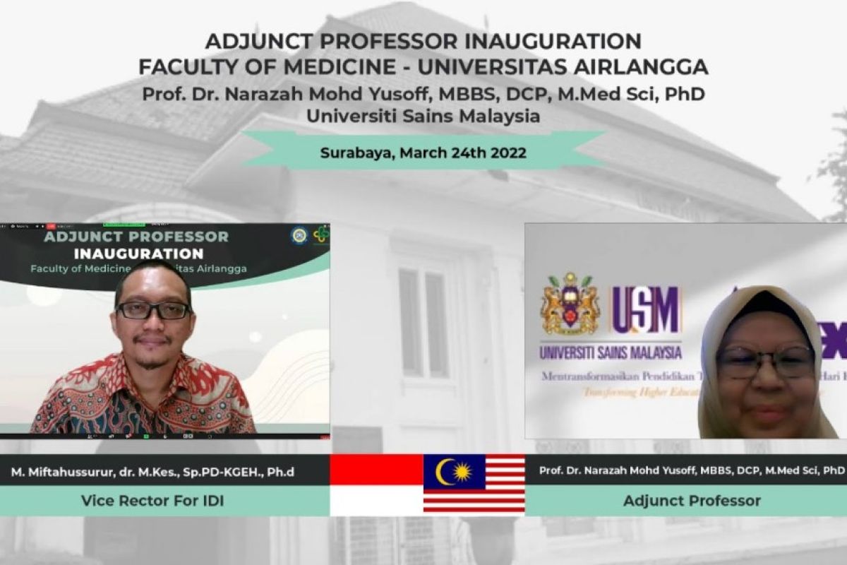 Surabaya (ANTARA) - Fakultas Kedokteran Universitas Airlangga melantik profesor asal University Sains Malaysia (USM), Prof. Dr. Narazah Mohd Yusoff, MBBS, DCP, M Med Sci, PhD, menjadi guru besar mitra (adjunct professor) dari Departemen Patologi Klinik.