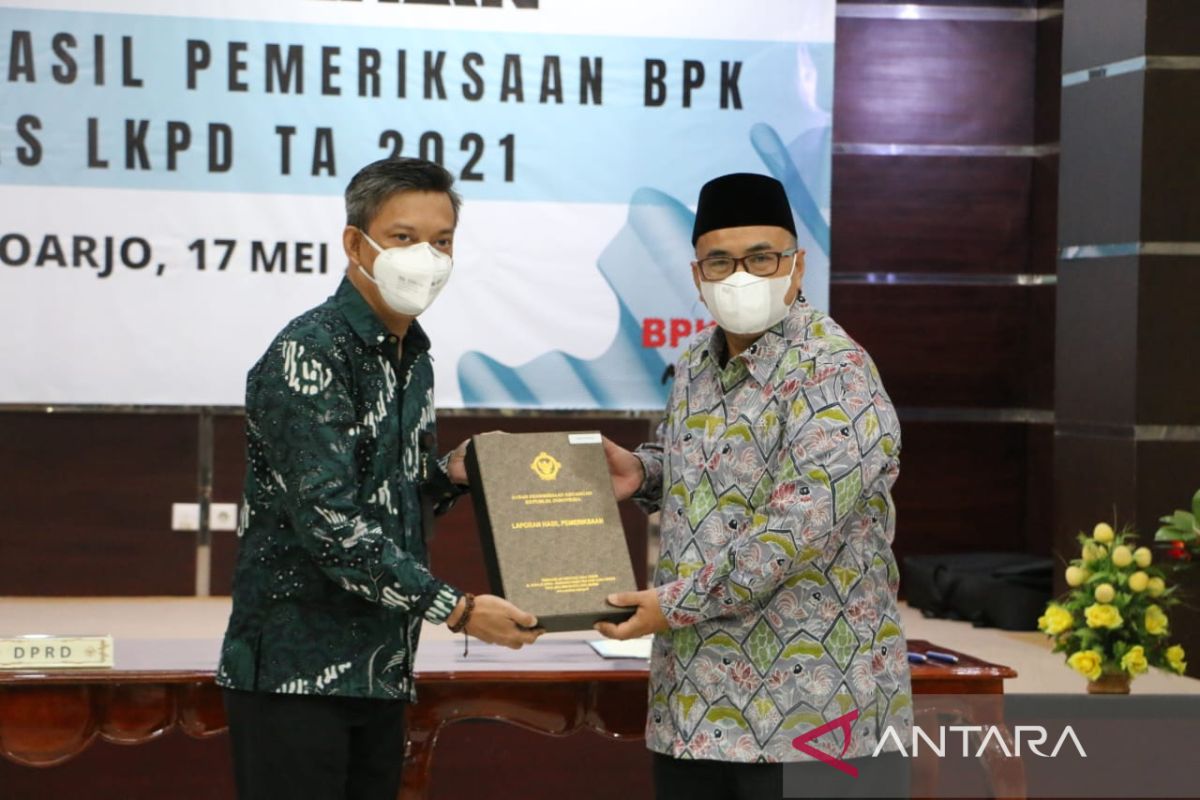 Kepala Sekretariat BPK Perwakilan Jawa Timur Sigit Pratama Yudha menyerahkan Laporan Hasil Pemeriksaan (LHP) atas LKPD Kabupaten Probolinggo Tahun Anggaran 2021 dengan opini WTP kepada Plt Bupati Probolinggo Timbul Prihanjoko dan Ketua DPRD Kabupaten Probolinggo Andi Suryanto Wibowo di Auditorium Kantor BPK Perwakilan Jatim di Sidoarjo, Selasa (17/5) sore.