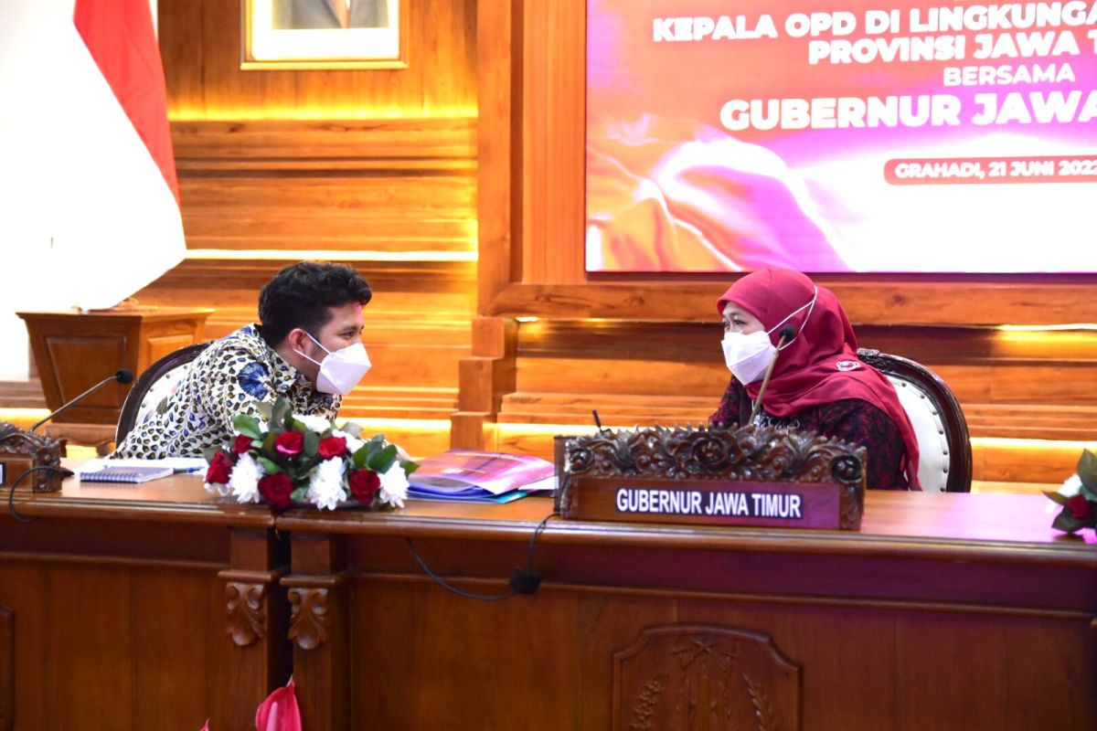 Gubernur Jatim Khofifah Indar Parawansa (kanan) berbincang dengan Wakil Gubernur Jatim Emil Elestianto Dardak (kiri) saat memimpin rapat koordinasi di Gedung Negara Grahadi Surabaya beberapa waktu lalu. ANTARA/HO-Biro Adpim Jatim.