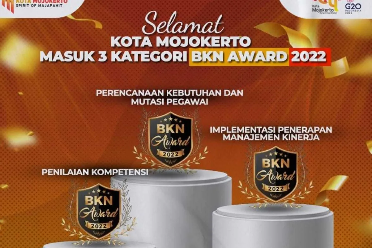 Pemerintah Kota Mojokerto Jawa Timur menerima anugerah tiga penghargaan pada BKN Award 2022 yang diselenggarakan Badan Kepegawaian Negara (BKN).