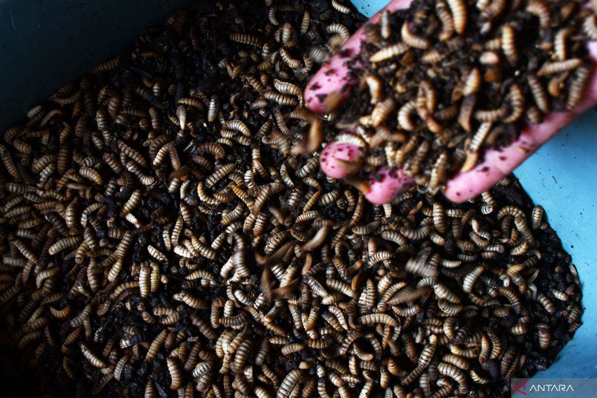 Pembudi daya memantau perkembangan larva maggot Black Soldier Fly (BSF) di tempat budi daya maggot di Kabupaten Madiun, Jawa Timur, Selasa (13/9/2022). Budi daya maggot yang dikelola Kelompok Sadar Wisata (Pokdarwis) Gunungsari Madiun tersebut menghasilkan 250 hingga 300 kilogram larva maggot per minggu dan dijual dengan harga Rp8 ribu hingga Rp10 ribu per kilogram. Antara Jatim/Siswowidodo/mas.